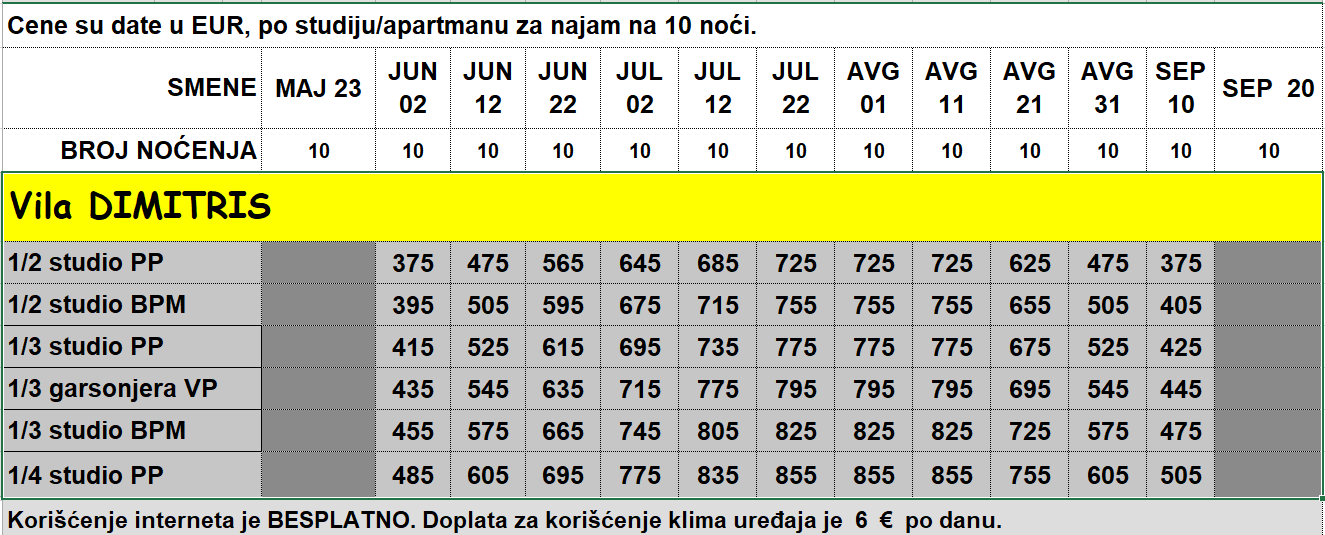 Korišćenje WI-FI interneta – BESPLATNO. Doplata za korišćenje klima uređaja je 5 € po danu.