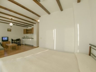 Sadržaj studija: francuski ležaj, kompletno opremljena kuhinja, kablovska TV, terasa, kupatilo, fen za kosu, pomoćni ležaj – sofa na razvlačenje. Studio može da primi maksimum tri odrasle osobe, sastoji se od jedne prostorije koja služi kao spavaća soba, dnevne sobe i kuhinja.