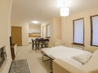 Sadržaj apartmana sa jednom spavaćom sobom: dnevni boravak, odvojena soba za spavanje sa dva standardna ili jednim francuskim ležajem, kompletno opremljena kuhinja, TV, terasa, kupatilo, fen za kosu, pomoćni lezaj – sofa na razvlačenje u dnevnom boravku, kamin. One bedroom apartment može da primi maksimum tri odrasle osobe i jedno dete