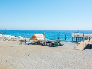 Na širokoj peščano – šljunkovitoj plaži udaljenoj oko 150 m od hotela, uz prelazak ulice, do koje se može stići i podzemnim prolazom. Ulaz u vodu je sa nanosom šljunka i kamenim pločama, gostima je na raspolaganju ponton. Suncobrani, ležaljke, peškiri i plažni bar se ne naplaćuju.