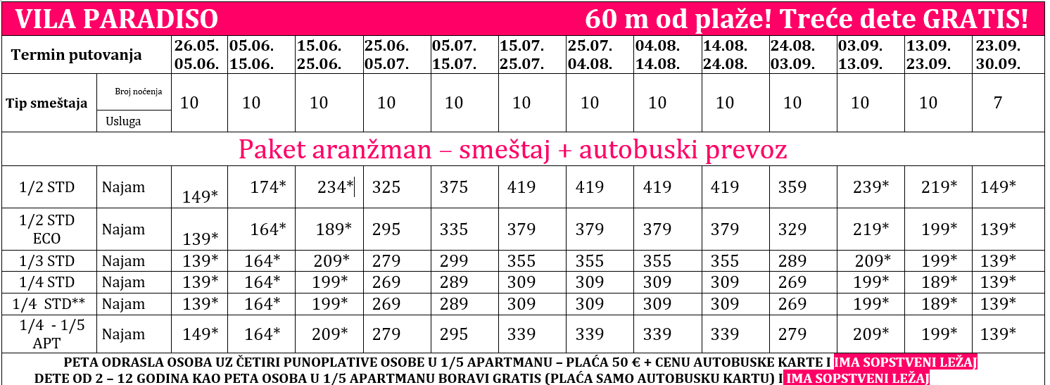 Cene iz tabele su izražene u evrima po osobi na bazi 10 noćenja – PAKET ARANŽMAN (smeštaj + autobuski prevoz)