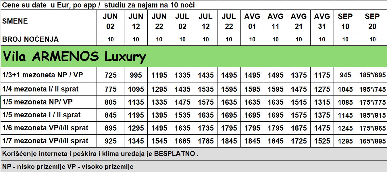 -Kod prodaje duple smene – prva smena gde je cena sa zvezdicom (*) i narednog termina, putnik plaća paket po osobi plus najam apartmana u sledećoj smeni. Isto važi i za poslednju smenu sa zvezdicom (*).